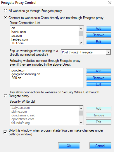 Grâce à Freegate, vous pouvez accédez à vos sites web étrangers favoris aussi rapidement qu'à des sites web locaux, sans installation et sans modifier les paramètres de votre système. Pour l'utiliser, il suffit simplement d'ouvrir le fichier exécutable du programme.